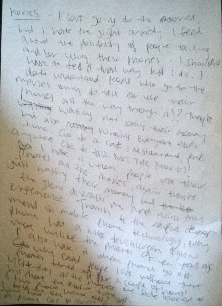I love going to the movies, but I hate the slight anxiety I feel about the possibility of people talking and/or using their mobile phones. I shouldn’t have to feel that way but I do, I don’t understand people who go to the movies only to talk or use their phones all the way through it!? They’re wasting not only their money but also ruining everyone else’s time. Go to a cafe, restaurant, park, anywhere else to talk NOT THE MOVIES! I hate it when people use their phones at the movies, again they’re just wasting their money but the glow distracts me and ruins my experience. Thanks to the rapid development in mobile phone technology, every phone has a huge touchscreen and glows more, unlike the phones of ten years ago. I also hate it when phones go off why can’t people live without their phones turned off for a couple of hours! Yesterday at the movies, one bloke looked at his phone the entire time and two phones went off. I told the one who had a phone call to turn it off.