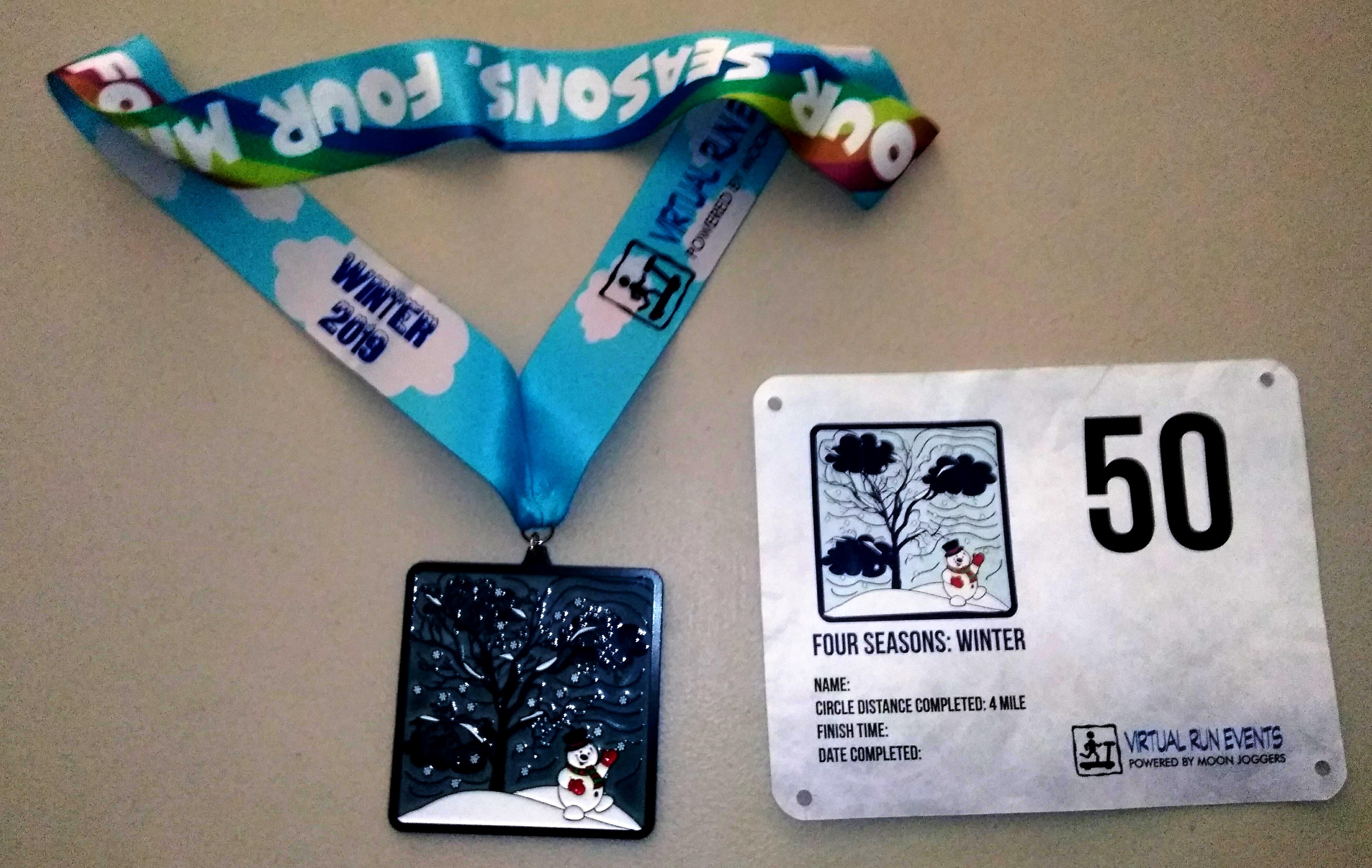 Winter Medal and Bib Posted on January 26, 2020 by Rach Loveday Leave a comment My Winter walk medal and bib Previous Return to 2019 Four Seasons: Four Miles—Winter