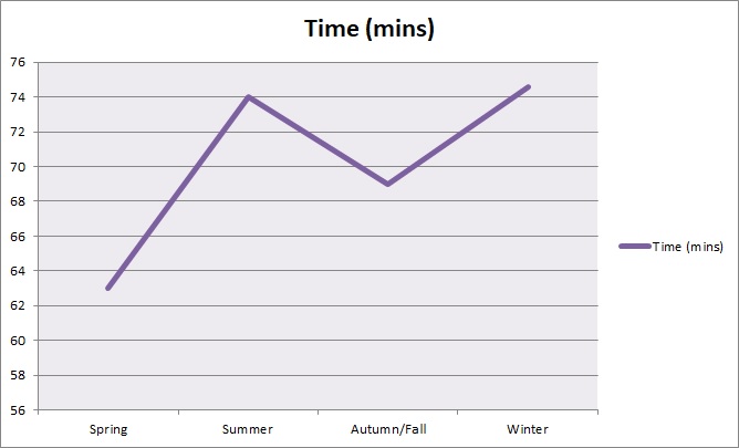 I completed three out of the four runs by doing a little over one lap of Lake Albert, in my home town of Wagga Wagga, with the fourth run being completed in two treadmill sessions at my local gym. The times were similar, with the quickest being 1 hour and 3 minutes (Spring) and my slowest at 1 hour, 14 minutes and 35 seconds (Winter).