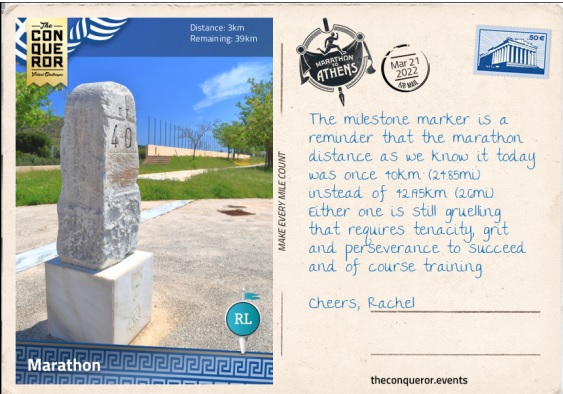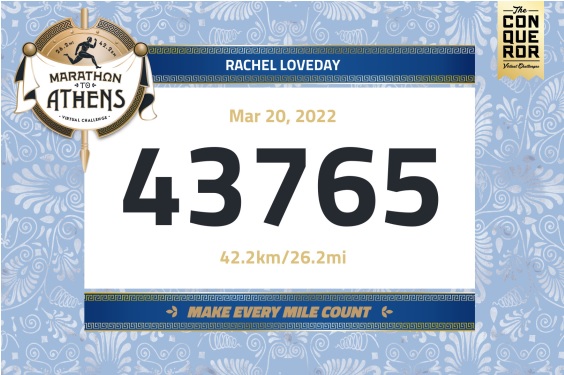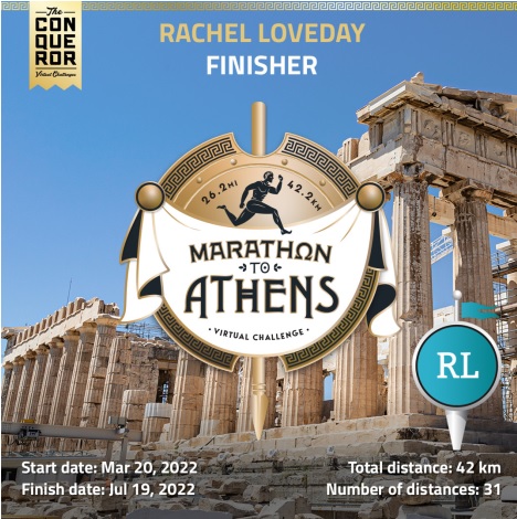 I have since completed my fifth Conqueror Virtual Challenge – Marathon to Athens.