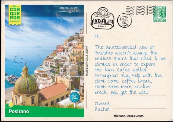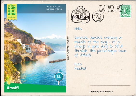 My goal for this year is to complete at least one Conqueror Virtual Challenge per season. The Amalfi Coast was my first Conqueror Virtual Challenge for 2023 and my summer (I’m based in Australia) Challenge. My autumn Challenge is Easter Island.