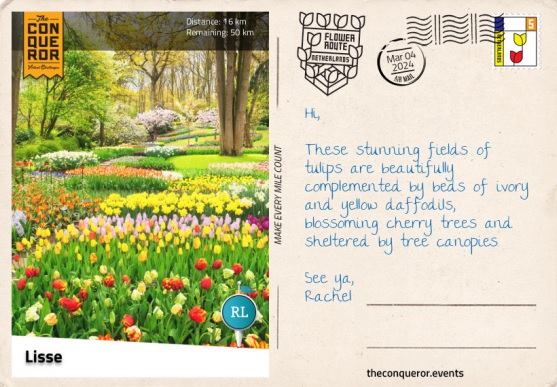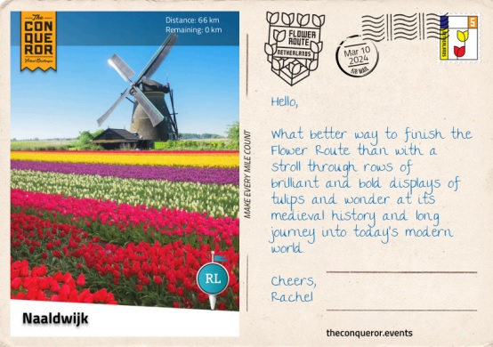 The Flower Route Conqueror Virtual Challenge takes participants “through scenic landscapes, blooming flower fields along rivers, villages, and iconic windmills of the Netherlands.”