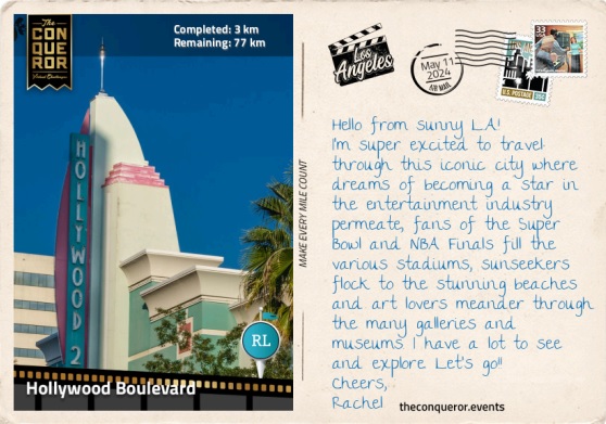 The Los Angeles Conqueror Virtual Challenge takes participants on a route “through luxury-laden lanes, vibrant sun-kissed shores that echo the rhythms of coastal life, ending at the legendary Walk of Fame, in California, US.”